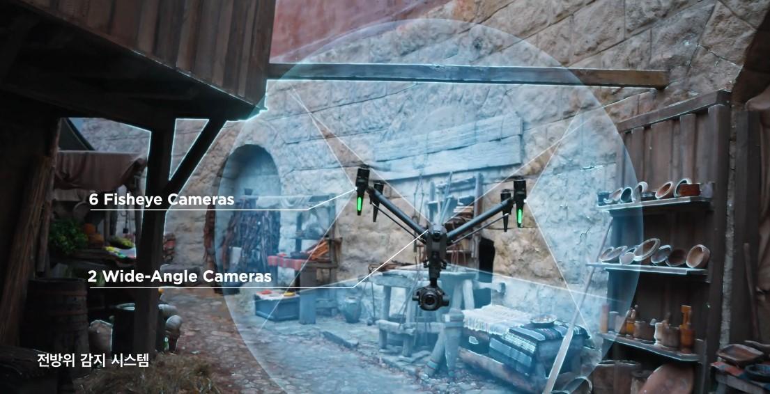 이만한 크기의 드론을 좁은 공간에서도 안전하게 비행할 수 있도록 이번 인스파이어 3에서는 최첨단 전방위 장애물 감지 기술을 투입, 즉 6개의 Fisheye 카메라 및 2개 Wide-Angle 카메라 총 8개의 카메라가 내장되어 있습니다.