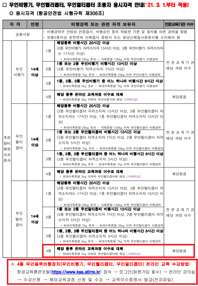 한국교통안전공단(드론관리처) / 조종자 응시자격 안내(4종 온라인 교육 수강방법)