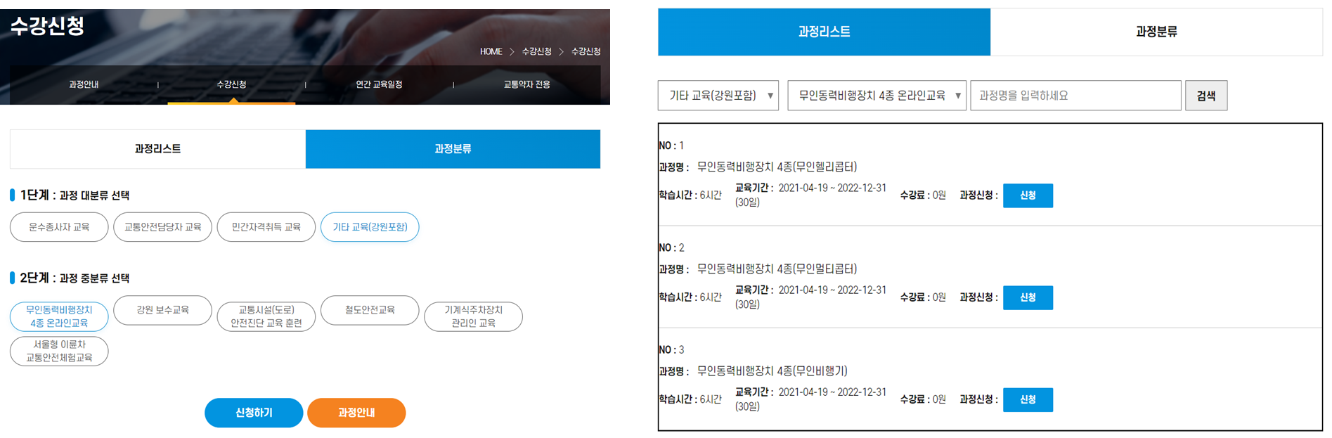 - 수강신청(1단계 : 기타교육 -> 2단계 : 과정 중 분류 / 무인동력비행장치 4종 온라인 교육)