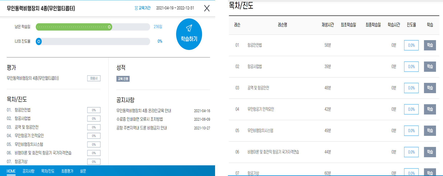 강의실에 입장을 하시면 남은 학습일, 나의 진도율에 대한 정보가 나오며, 또한 위에 작성된 목차/진도를 세분화해서 정보를 나타내고 있습니다. 총 6시간의 교육 이수 후 학과시험(필기평가 20문제)을 70점 이상 점수 얻으셔야 드론 4종 자격증 수료증이 나오게 됩니다.