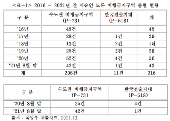 - “수도권 비행금지구역은 청와대 등 주요 국가기관 시설이 있는 곳이고, 한국전술지대는 휴전선 지역으로 군사적으로 예민한 지역이다”며, “국가 안보상 중요한 지역에서는 드론 비행을 자제해야 하고, 정부도 부처별로 제각각인 드론 불법 비행에 대한 체계적인 일원화 관리와 통계산출로 드론 불법 비행을 예방할 필요가 있다”