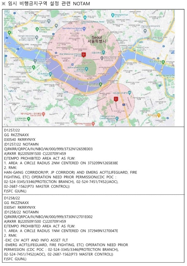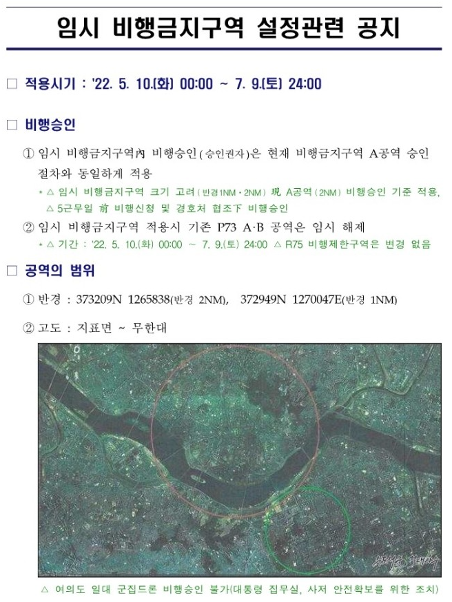 군이 설정하고 있는 수도권 비행금지구역은 2단계. 청와대를 중심으로 일정한 반경으로 그어진 '수도권 비행금지 구역(P-73A)'은 남ㆍ서쪽으로는 한강, 동쪽으로는 중랑천을 경계선으로 하고 있으며, 원칙적으로 비행이 허락되지 않는다. 항공기가 외곽 비행금지 구역에 진입하면 일차적으로 교신에 의한 경고를 하고, 이를 어기고 2단계의 서울 중심부 일정 구역을 침범할 경우 무조건 사격을 가하도록 돼 있다.