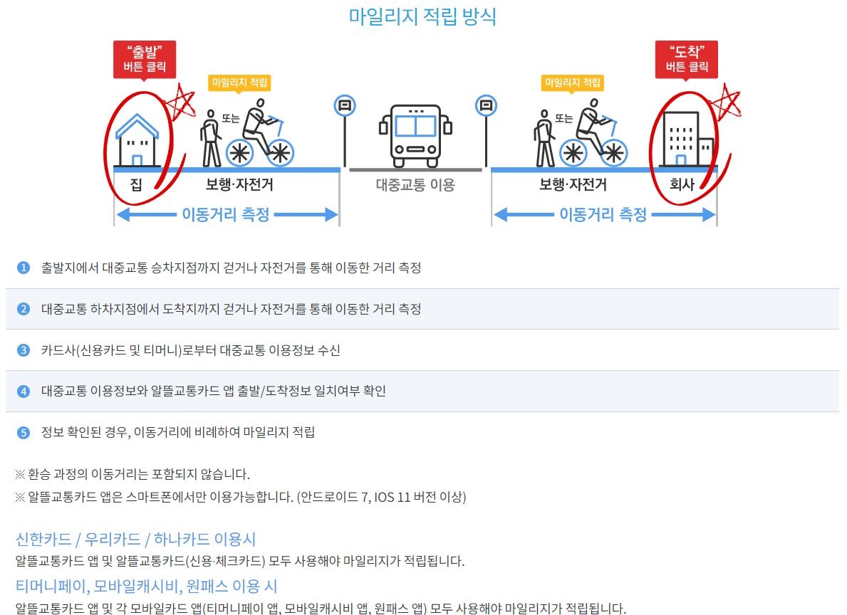 대중교통 이용 시 첫 정류장까지의 도보·자전거 이동 거리→출발 정류장 및 도착 정류장→종착지까지를 고려하여 대중교통 요금의 일정 비율을 마일리지고 계산하여 적립, 가입 시 이용되는 출발·도착지만 이용할 수 있는 것으로 오해받을 수 있지만, 모든 대중교통 이용 내역은 설치된 애플리케이션과 발급된 전용 교통카드를 사용하는 것으로 가정됩니다.