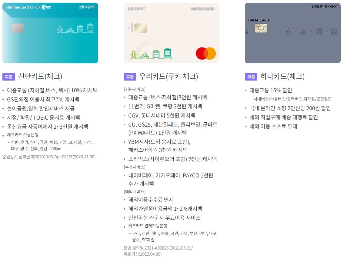※ "체크카드"와 "신용카드"로 나눠니깐 잘 구분해서 신청, 각 카드사 별로 갖는 혜택도 틀리기 때문에 본인에게 맞는 카드를 골라 신청