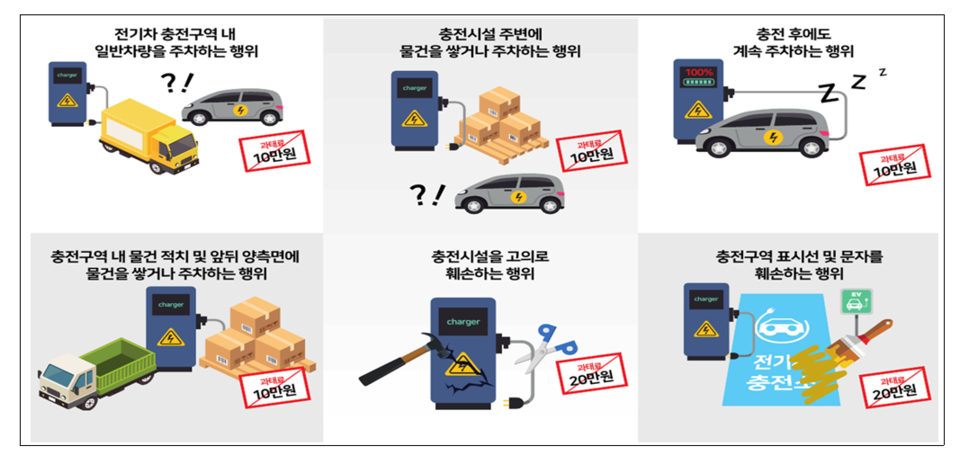 - 전기자동차가 일정 시간(급속 1시간, 완속 14시간) 이상 계속 주차하는 경우(10만 원)