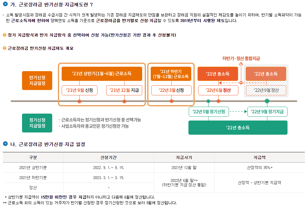 상/하반기로 나눠 6개월간의 소득을 파악하고, 해당 연도 소득을 기준으로 반기별 근로장려금을 신청하고 지급받을 수 있습니다.
