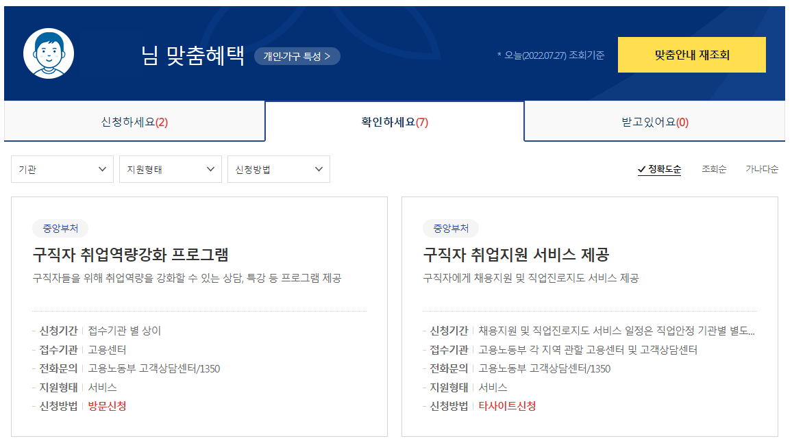 예를 들어 가정이 있는 분들의 경우 육아기 근로시간, 단축급여, 육아휴직 급여, 등 육아에 필요한 정책, 청년(취준생)에게 필요한 고용 창업 등 여러 가지 보조금을 알려주며 정말 다양하게 있습니다.