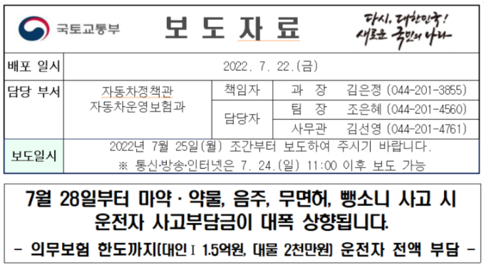 국토교통부는 마약, 약물, 음주, 무면허, 뺑소니 사고 시 운전자가 의무보험 한도 내에서 "피해자에게 지급된 보험금 전액"을 사고 분담금을 부담하게 하는 "자동차 손해배상 보장법" 개정안이 22년 7월 28일부터 시행됩니다.