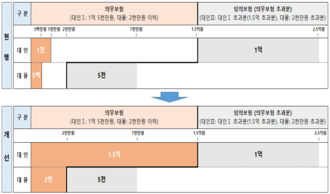 | 대물 | 5백만원(사고 당 1건) | 1백만원(사고 1건당) | 대물 | 5천만원(사고 1건당) | |