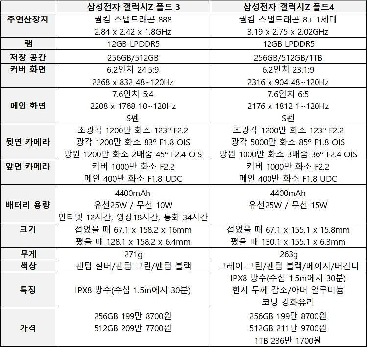 | 저장용량 | 256 / 512 / 폴드는 1TB까지 | |