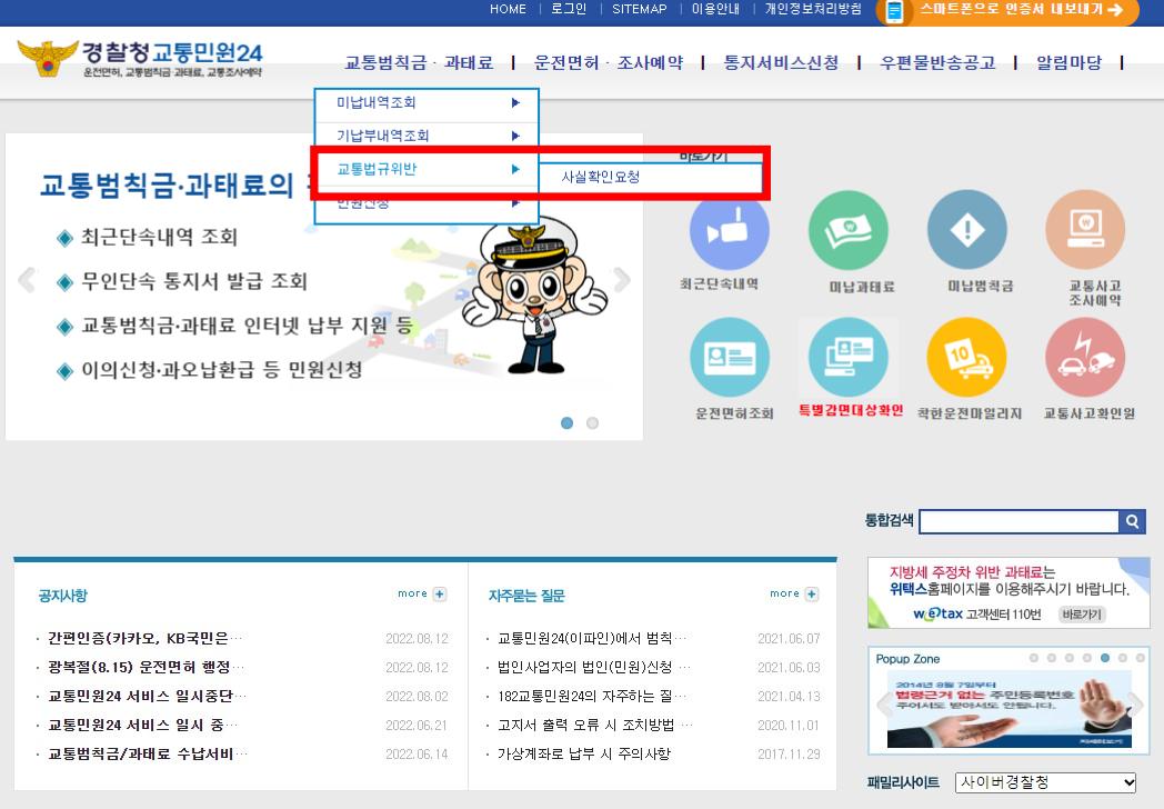 - 상단 메뉴 교통범칙금/과태료 -> 교통법규위반 -> 사실확인요청