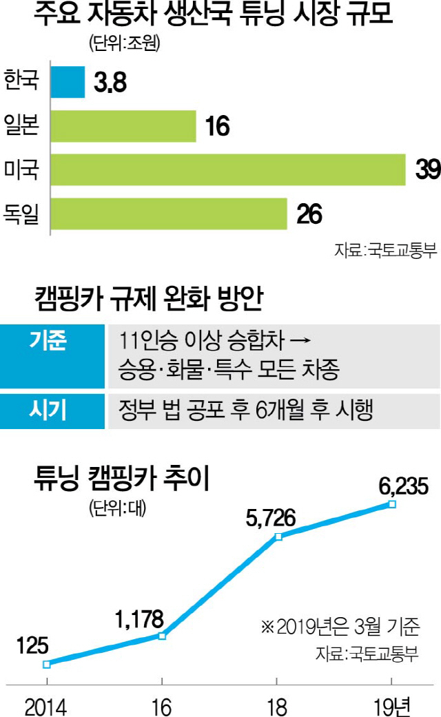 또한 승차 정원이 11인 이상인 업무용 승합차의 좌석을 떼 승용 캠핑카로 구조 변경한 경우 승용차로의 차종 변경을 허용하고, 개인용 승용차로 자동차보험에 가입할 수 있게 했다. 지금까지는 개인용 자동차보험보다 10%가량 비싼 업무용 자동차보험을 들어야 했었다. 자동차 관리법령 개정 이후 튜닝이 승인된 차량은 이달 기준 1만 2200대 정도다.