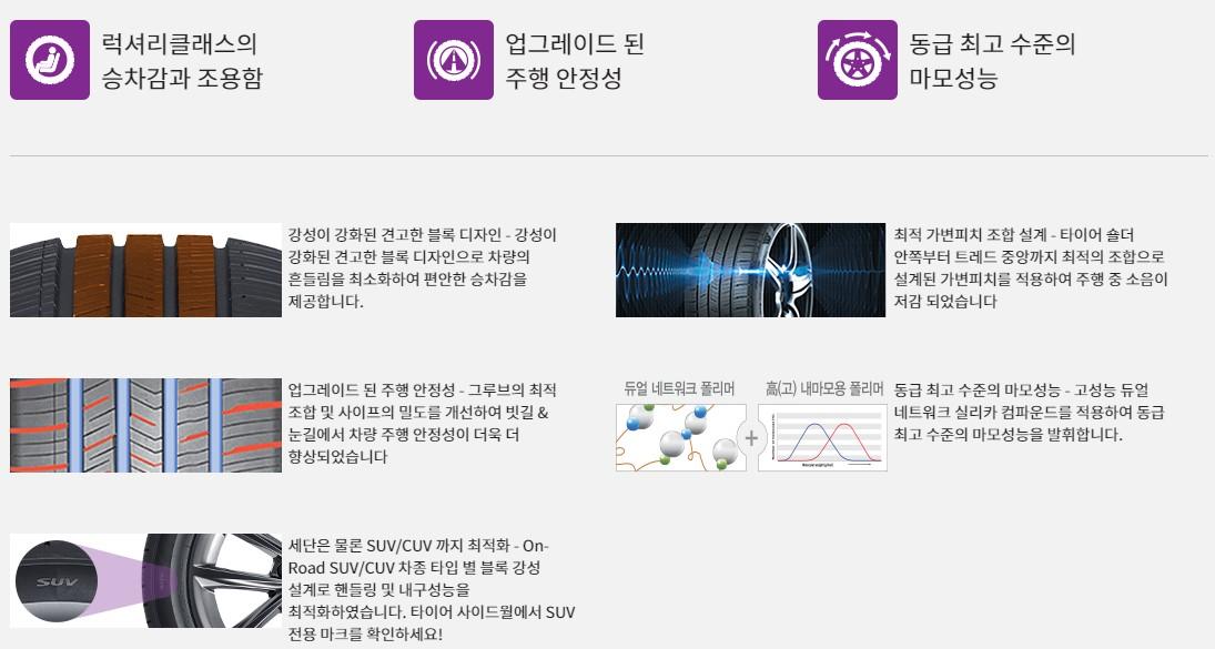 - On-Road SUV/CUV 차종 타입 별 볼록 강성 설께로 핸들링 및 내구성능을 최적화(타이어 사이드월에서 SUV 전용 마크 확인 가능)