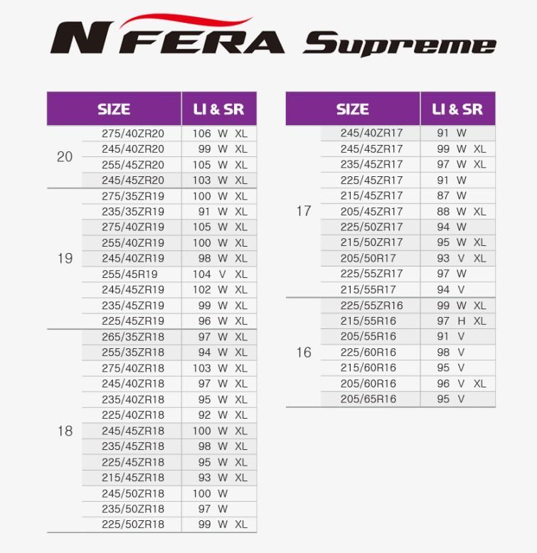 엔페라 슈프림은 총 2가지의 타이어로 나왔습니다. 기존 엔페라 슈프림(N'FERA Supreme)과 엔페라 슈프림 SUV(N'FERA Supreme SUV)입니다.