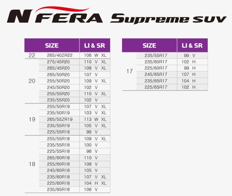 엔페라 슈프림은 총 2가지의 타이어로 나왔습니다. 기존 엔페라 슈프림(N'FERA Supreme)과 엔페라 슈프림 SUV(N'FERA Supreme SUV)입니다.