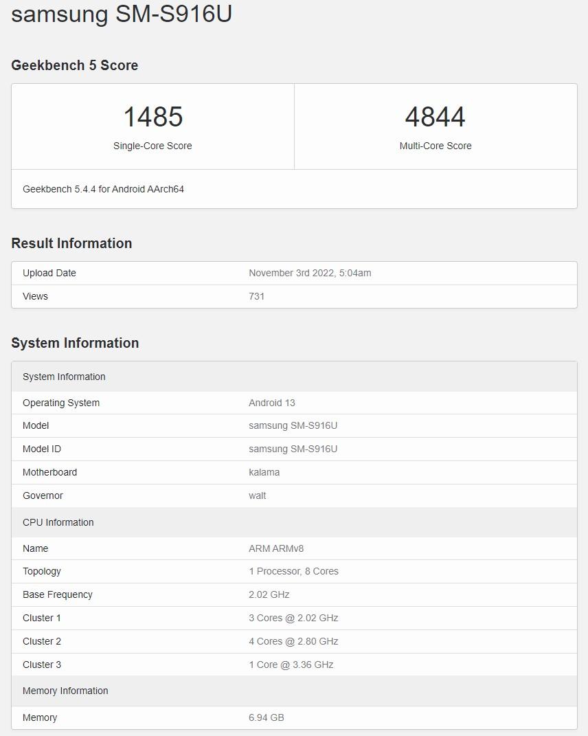 현재까지 알려진 갤럭시 S23의 기본적인 모델의 벤치마크 점수는 미국 SM-S916U 모델로서 싱글, 멀티코어 1485점, 4844점으로 점수들이 나오고 있습니다.